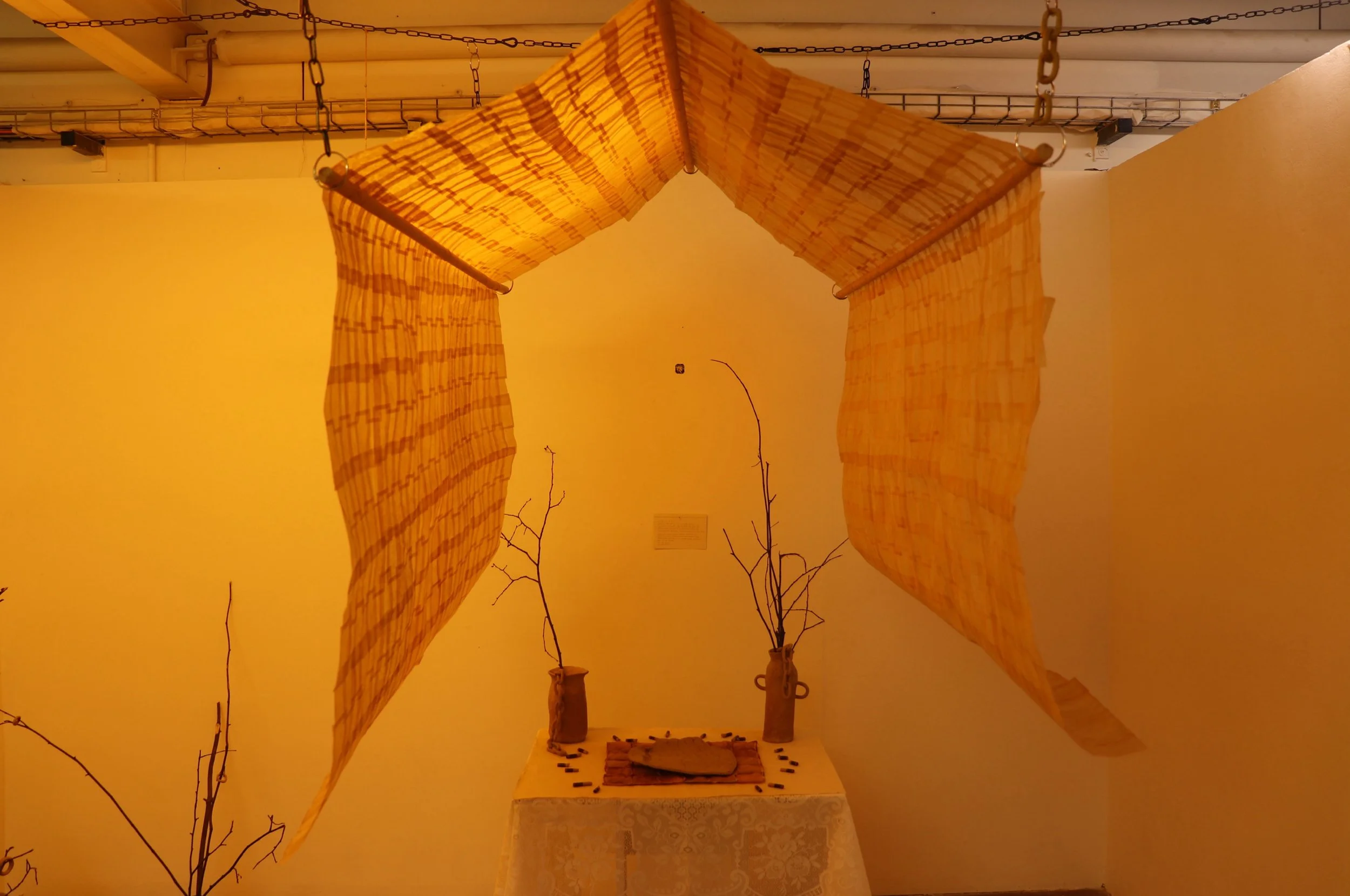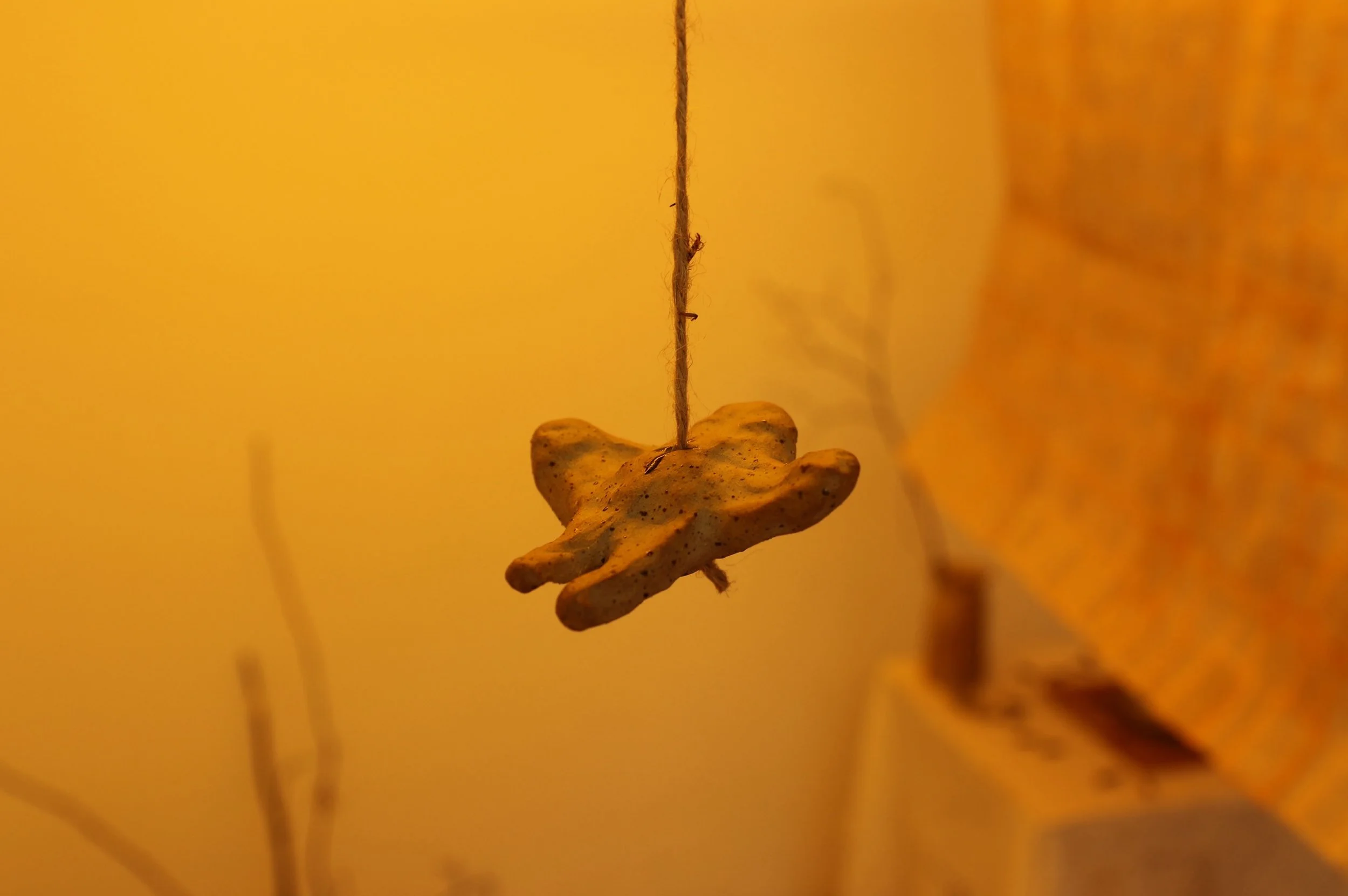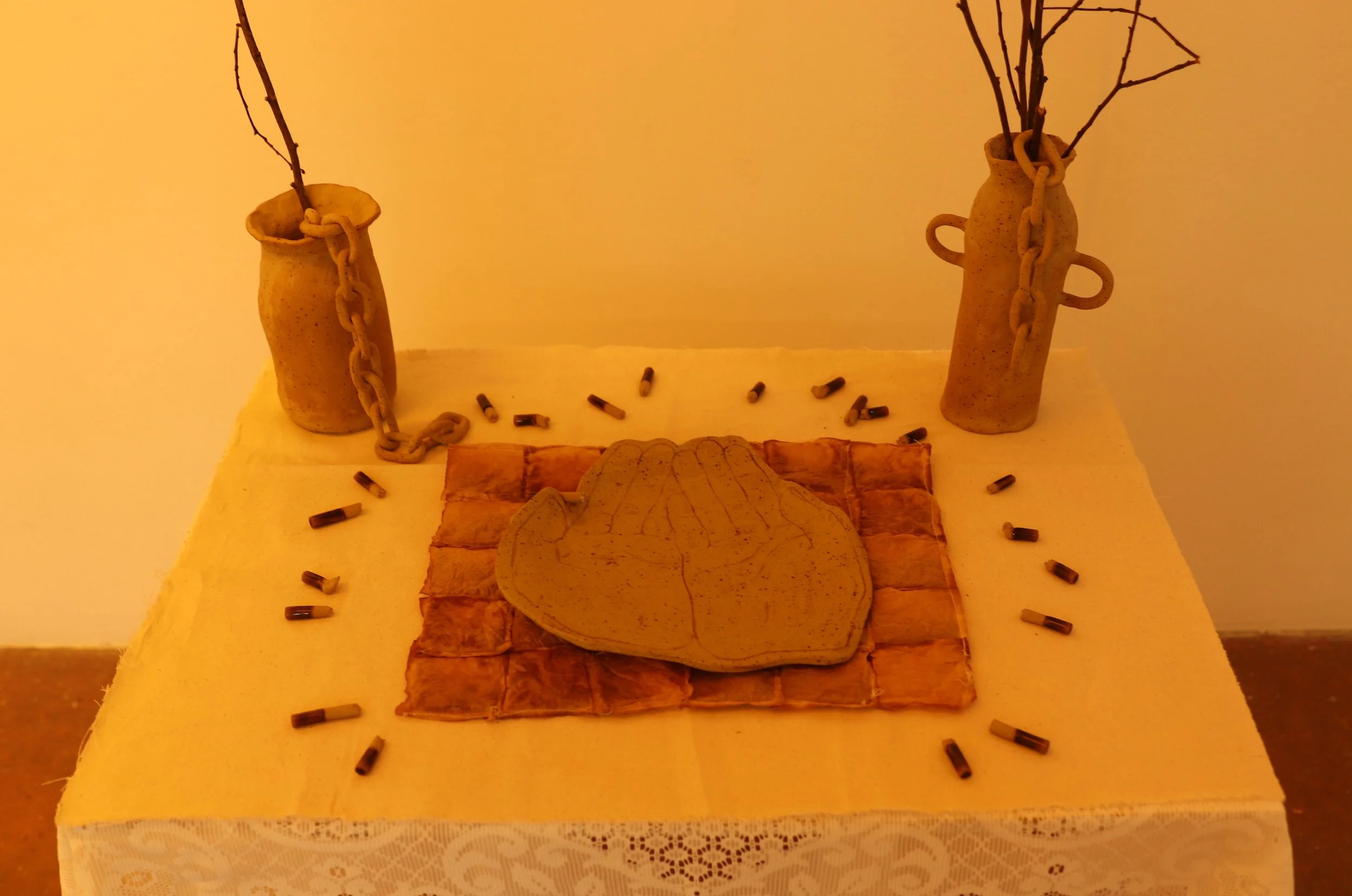 Using teabags as a material, they go through a rigorous process to create the house tent. The teabag reflects a lifecycle: it lies dormant, is used for brewing (finally activated and alive), and then discarded. Creating this space within a space, the tent feels protective. When inside, the low table presents a ceramic plate in the shape of cupped hands, seemingly waiting for your arrival. Carefully placed ceramic cigarette butts outline the setting, and obscured vessels adorn the table, carrying bare twigs and delicate ceramic chains. This ceremonial atmosphere is intensified by a poem nailed to the wall, reciting an obvious reminder that "you are alive".