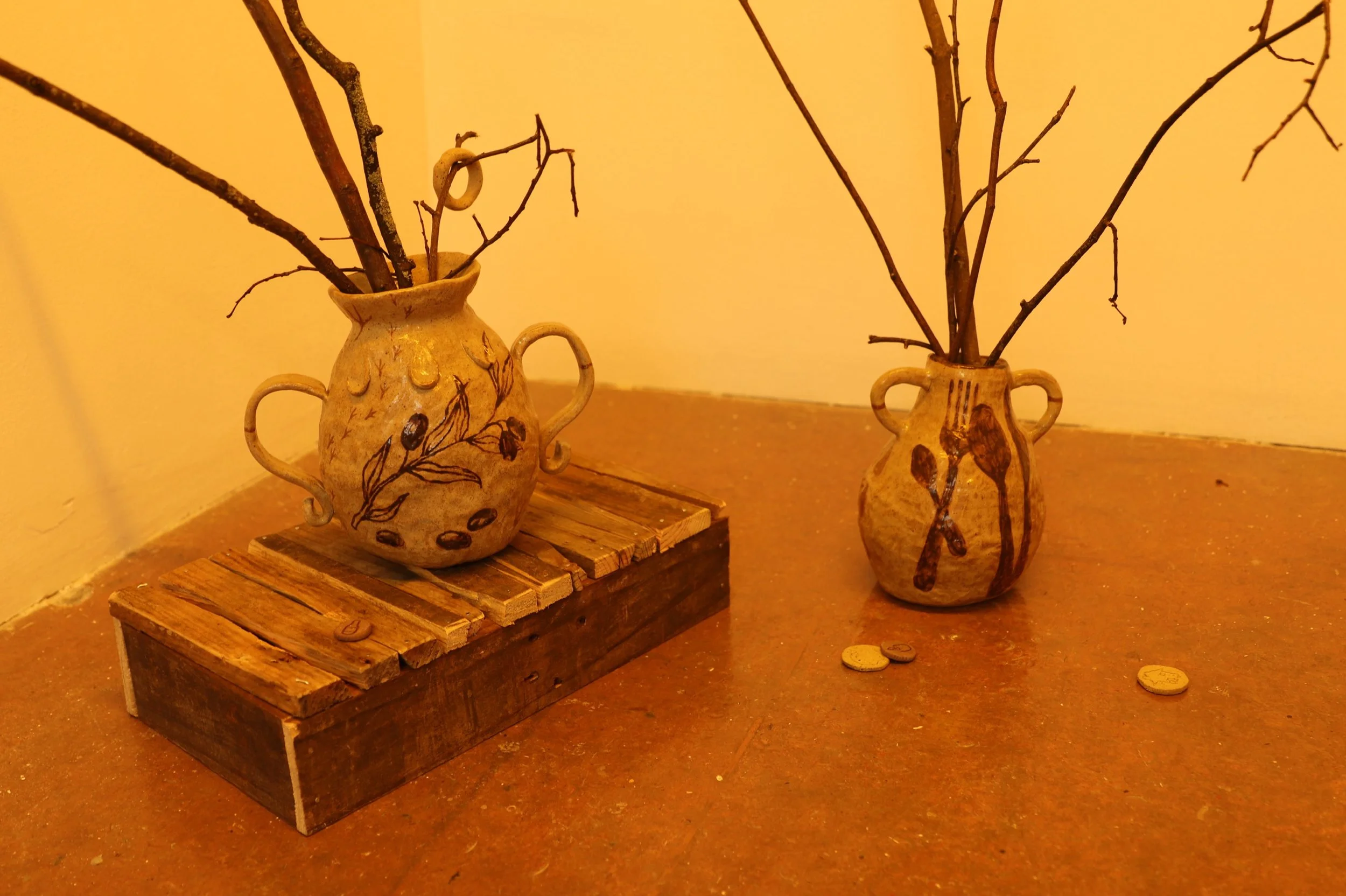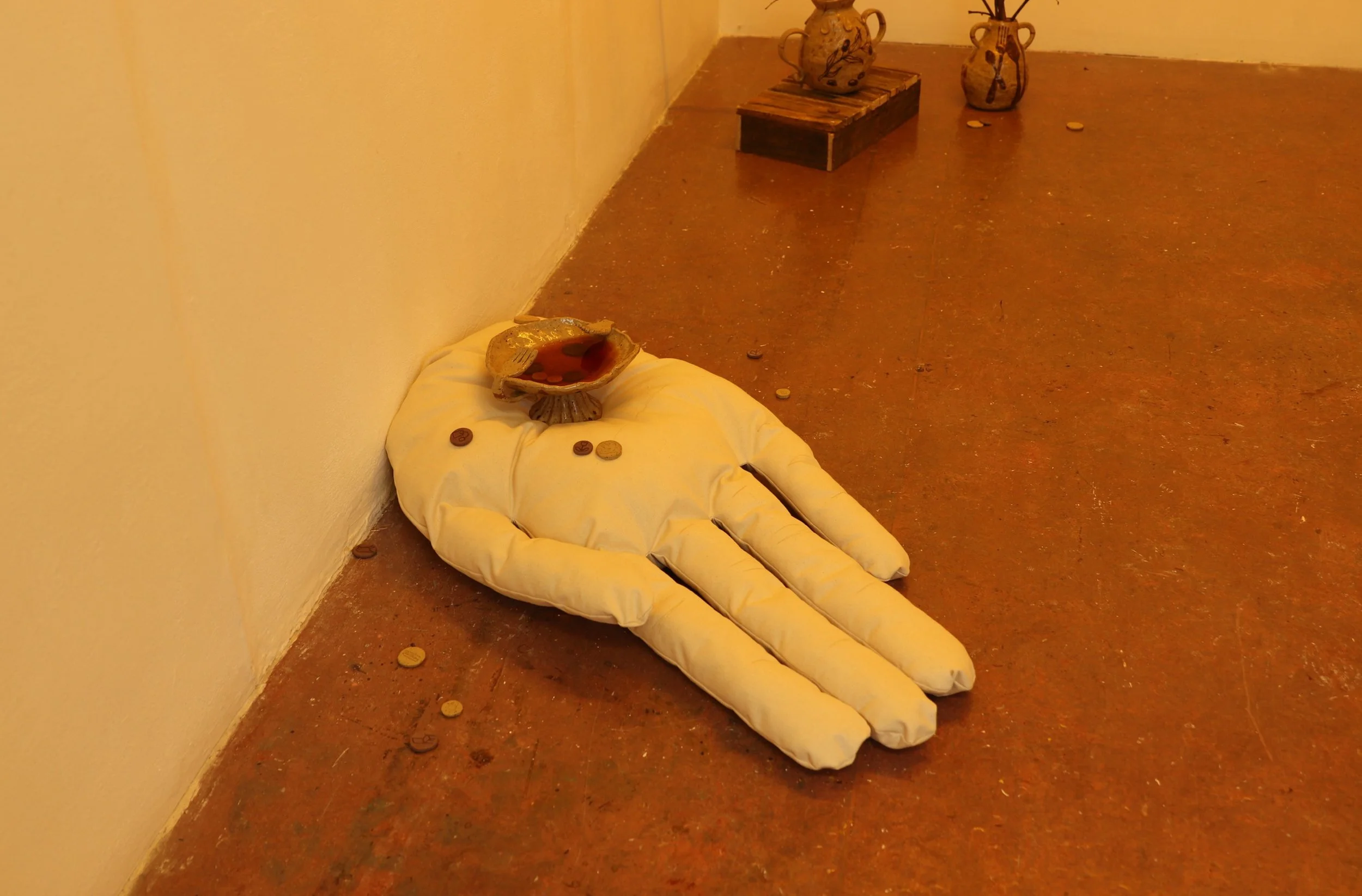Body-less hands line the walls, ceiling, and floor. Holding on, and empty - reaching, and yearning. Ceramic birds are hung by twine, frozen in their material and fleeting, with nowhere to go. Vases sit on the floor, carefully decorated with rituals - one reflecting the religious, and the other reflecting domesticity.
