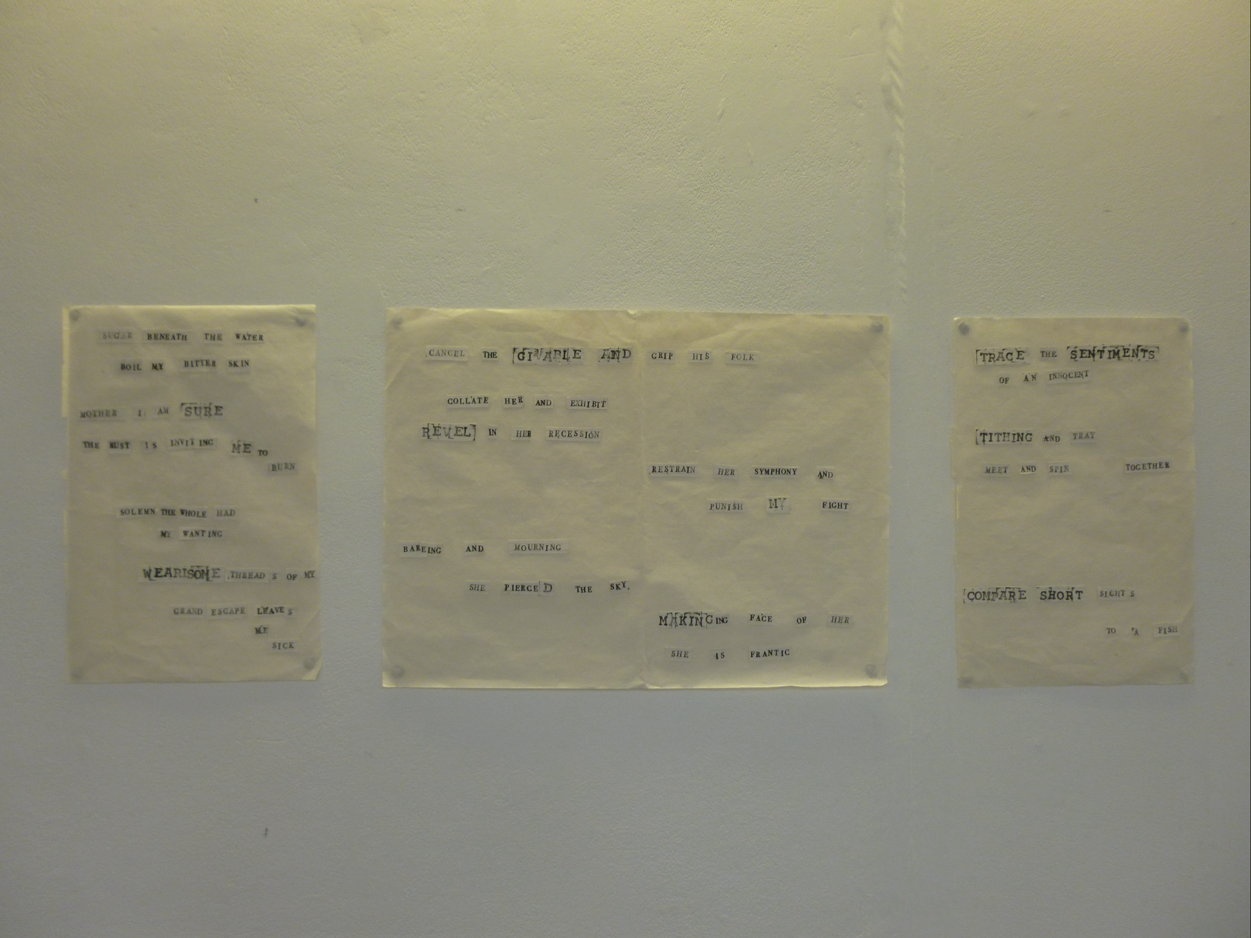 With letter-press stamps, ink, and a word generator, we generated word fragments to create a dialogue of poems. Ephemeral and random, lost words begin to take shape through trial-and-error. Conversations begin to appear: womanhood, loss, faith, anguish.